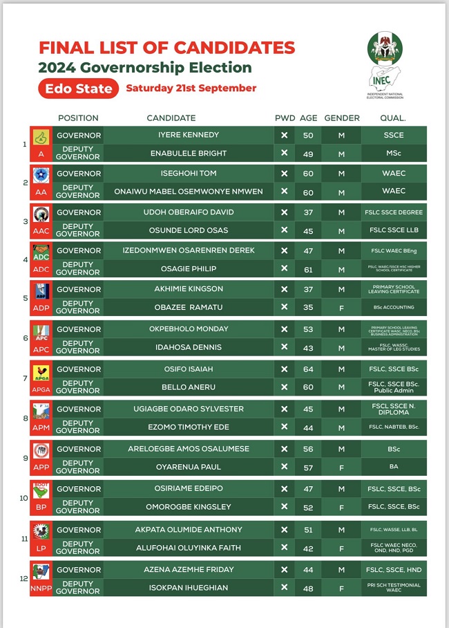 The Independent National Electoral Commission (INEC) has announced the final list of candidates for the Edo State Governorship election.